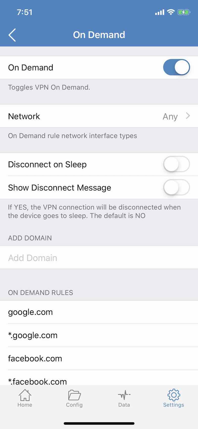 比起 Surge,Shadowrocket 支持一個讓人意外的功能—— On Demand。這其實是 VPN 的一個有意思的功能,它可以讓 iOS 系統級監聽你正在請求的域名,當遇到特定的域名時,就先啟動 VPN,再請求這個域名。